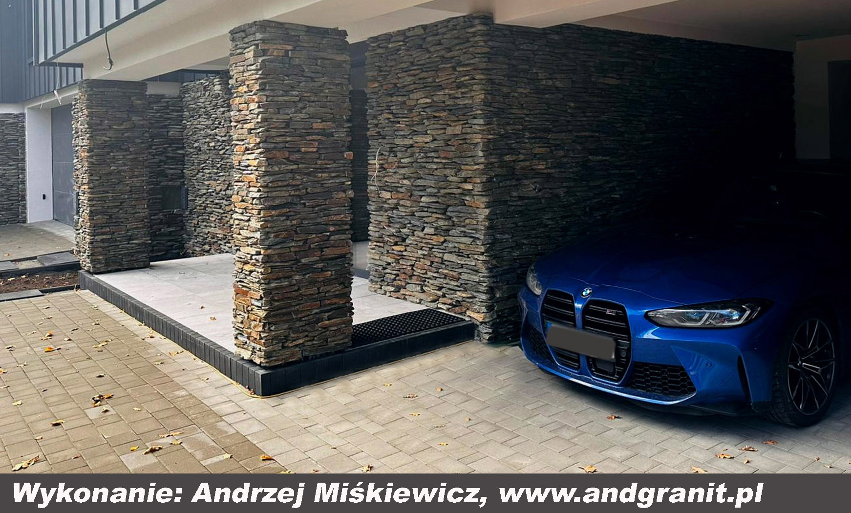 Kamień pakowany jest w niezwrotne worki typu Big-Bag. Przybiera on formę płytkową. Jedna krawędź jest cięta w celu ułatwienia jego układania - gwarantuje pełne przyleganie do ściany. Pozostałe krawędzie są nieregularne. Kamień jednostronnie cięty może być zastosowany przy budowie murów warstwowych i oporowych oraz kominków i grilli ogrodowych. Doskonale sprawdzi się na cokoły budynków oraz jako elementy architektury ogrodowej. Występuje w trzech różnych szerokościach: